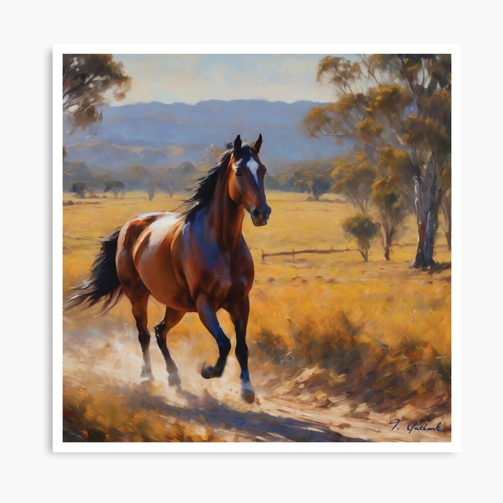 Beautiful, bright, colourful digital art print, with 0.5cm white edged border. Size: 8 x 8 inch Printed digitally on archival medium weight white paper. Would make the perfect gift for a horse lover!