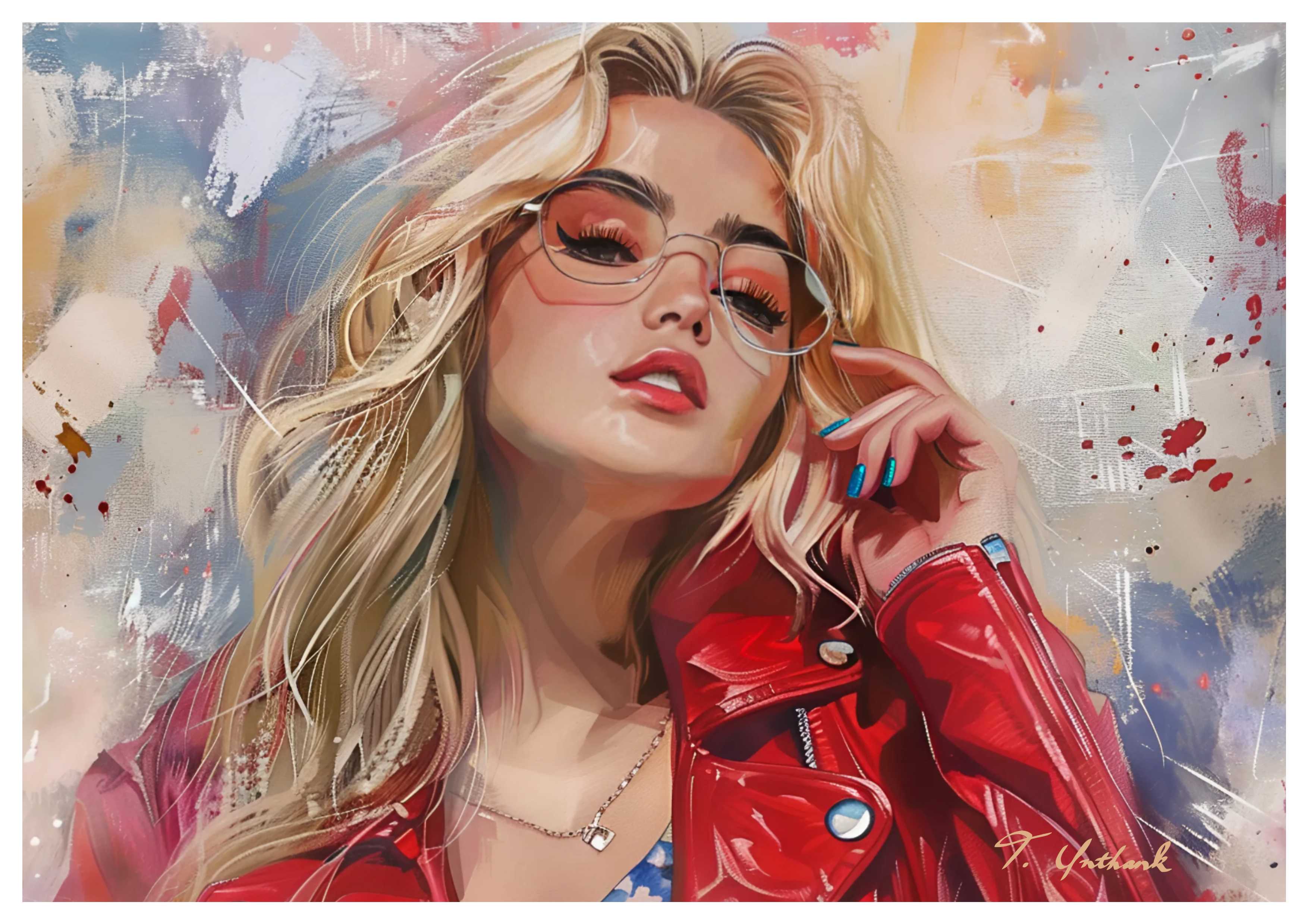 Beautiful, soft-toned digital art print, with a 0.5cm white edged border. Size: A4. Printed digitally on archival medium weight white paper. This artwork was inspired by the confident, dreamy pop icon Sabrina Carpenter- with a touch of retro charm. A perfect gift for any dedicated pop music fan! Each print arrives in a protective plastic sleeve, unframed.