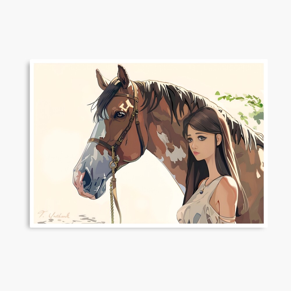 This stunning digital artwork beautifully captures the quiet bond between a young woman and her horse. With soft tones, elegant detailing, and a touch of modern artistry, this piece radiates calm, strength, and connection.